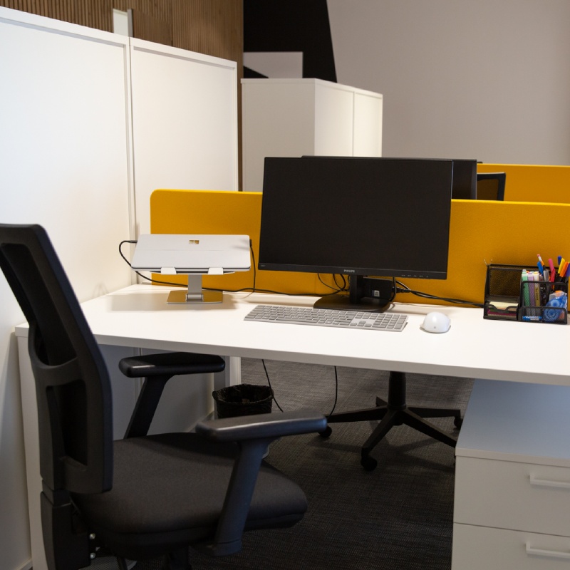Mesa individual amplia, silla ergonómica de alta gama, cajonera privada y armario para tus pertenencias.